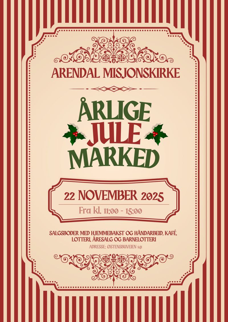 Lørdag 22.november fra kl 11:00 - 15:00 er det vår årlige julemarked i Arendal Misjonskirke!
