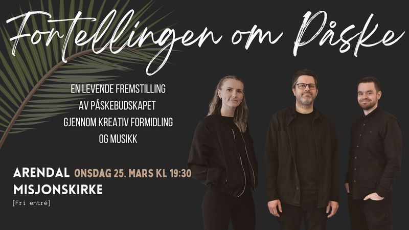 Onsdag 25 mars kl. 19:30 får vi besøk av Morten Svanevik, Lillian og Stian Lauvås som vil presentere «Fortellingen om påske» - en gripende forestilling som gjennom kreativ formidling og musikk maler et bilde av den dramatiske påskeuken i Jerusalem for over 2000 år siden. Forestillingen varer i ca.75 minutter, og passer for både voksne, ungdom og barn over 10 år. Inviter med venner, kom med senka skuldre og dykk ned i påskens budskap sammen med oss! [Fri entré]